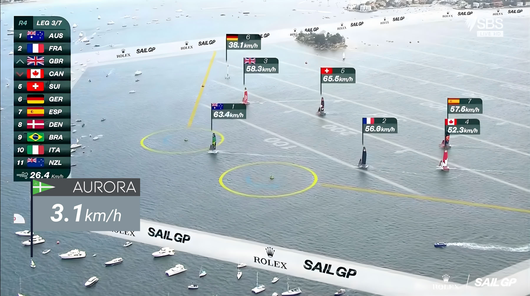What no briefing document can quite convey is that the entry gate for the F50s to the race course runs directly through the spectator fleet. The catamarans came through at speed. Aurora held her position. This is the SailGP version of a front-row concert — you are not watching from the stands.